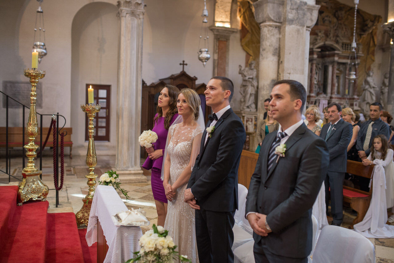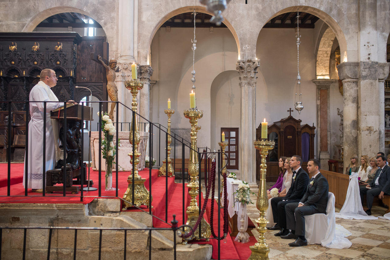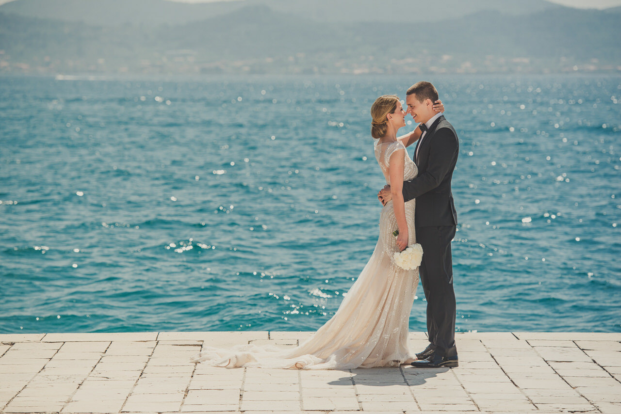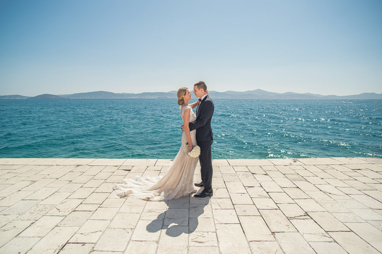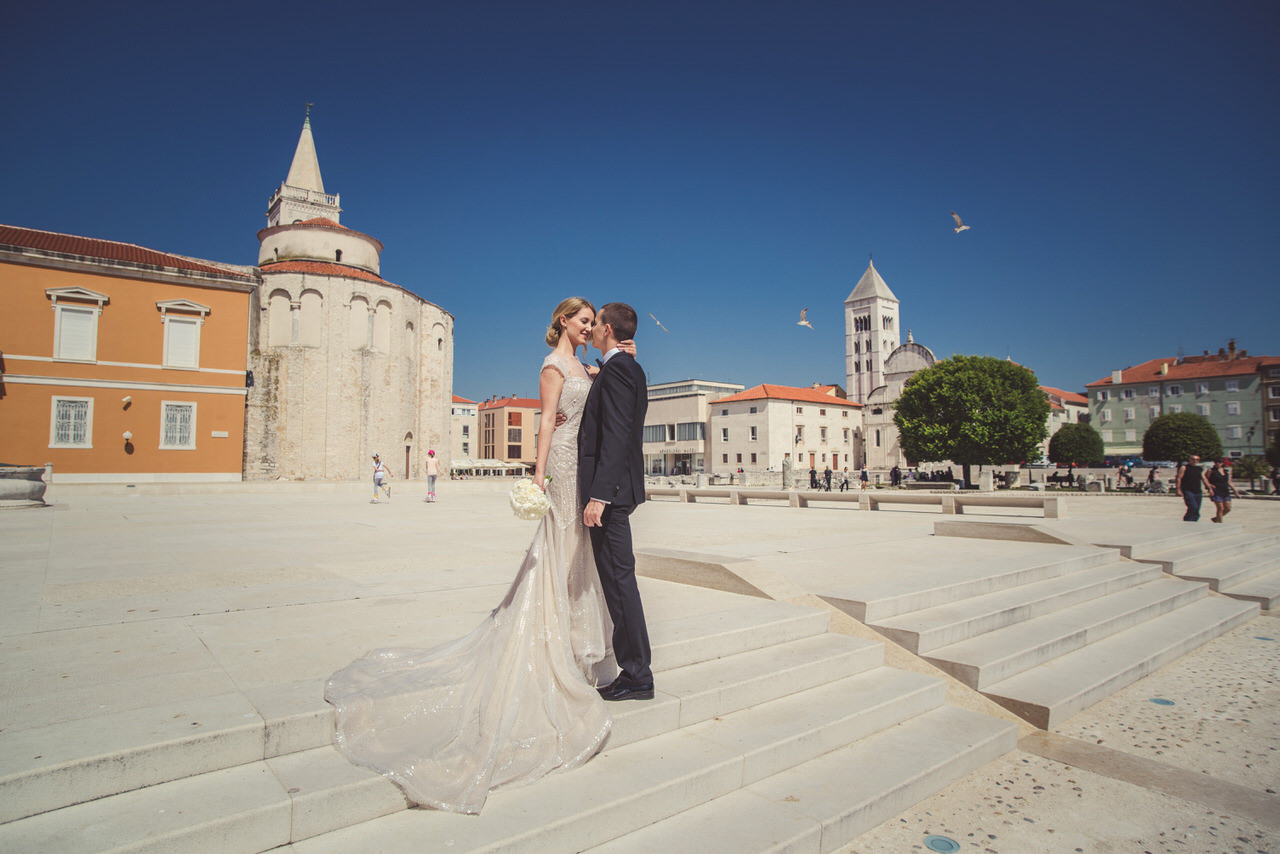 A gloriously sunny day with a light autumn breeze in the air. The clear blue sea with that familiar Dalmatian fragrance. The scene was set for Tina and Igor’s romantic wedding held in the beautiful city on Zadar half way along the ever-popular Croatian Dalmatia coast. Zadar is amazing city we highly recommend to visit. It is not just boring old city. Here you can enjoy musseums, festivals, food, drink you name it. Also it is a great starting point for daily trips to Dalmatian Islands, Kornati, Silba, Dugi Otok, etc.